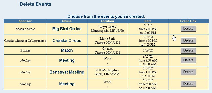 To delete an event that you have created, click the “Delete” button to the right of an event.