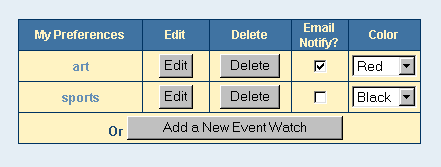 A listing of your saved searches, or “Event Watches” will appear. You can choose to Edit, Delete or change the display color of your existing Event Watches. To be notified of new events that fall into your Event Watch criteria, check the “E-mail Notify” box next to the appropriate Event Watch.